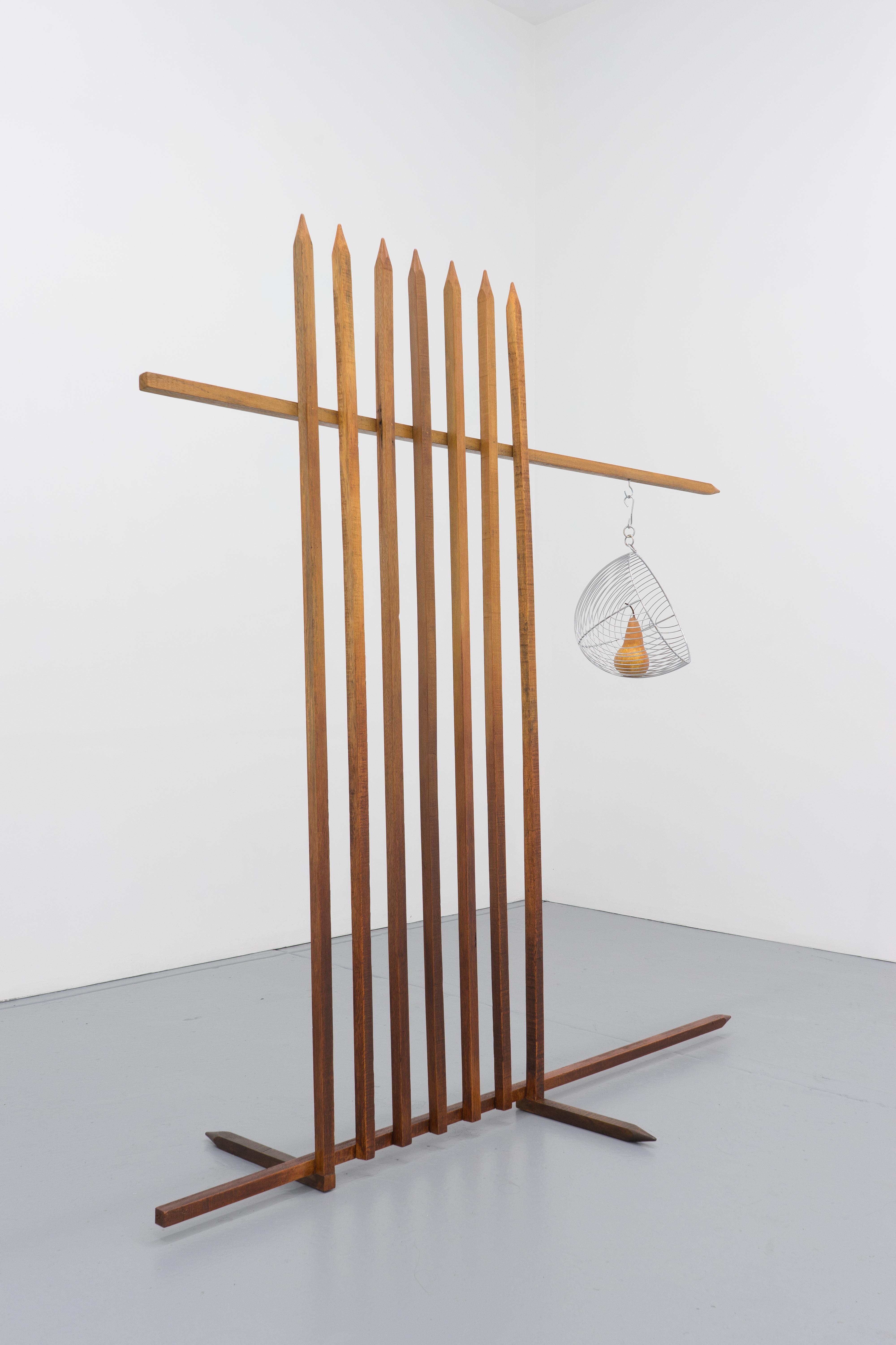 Gateway to cosmopolitan living, 2018, garden stakes, stainless steel, water based stain, Beurré Bosc pear, 153 x 150.5 x 57 cm