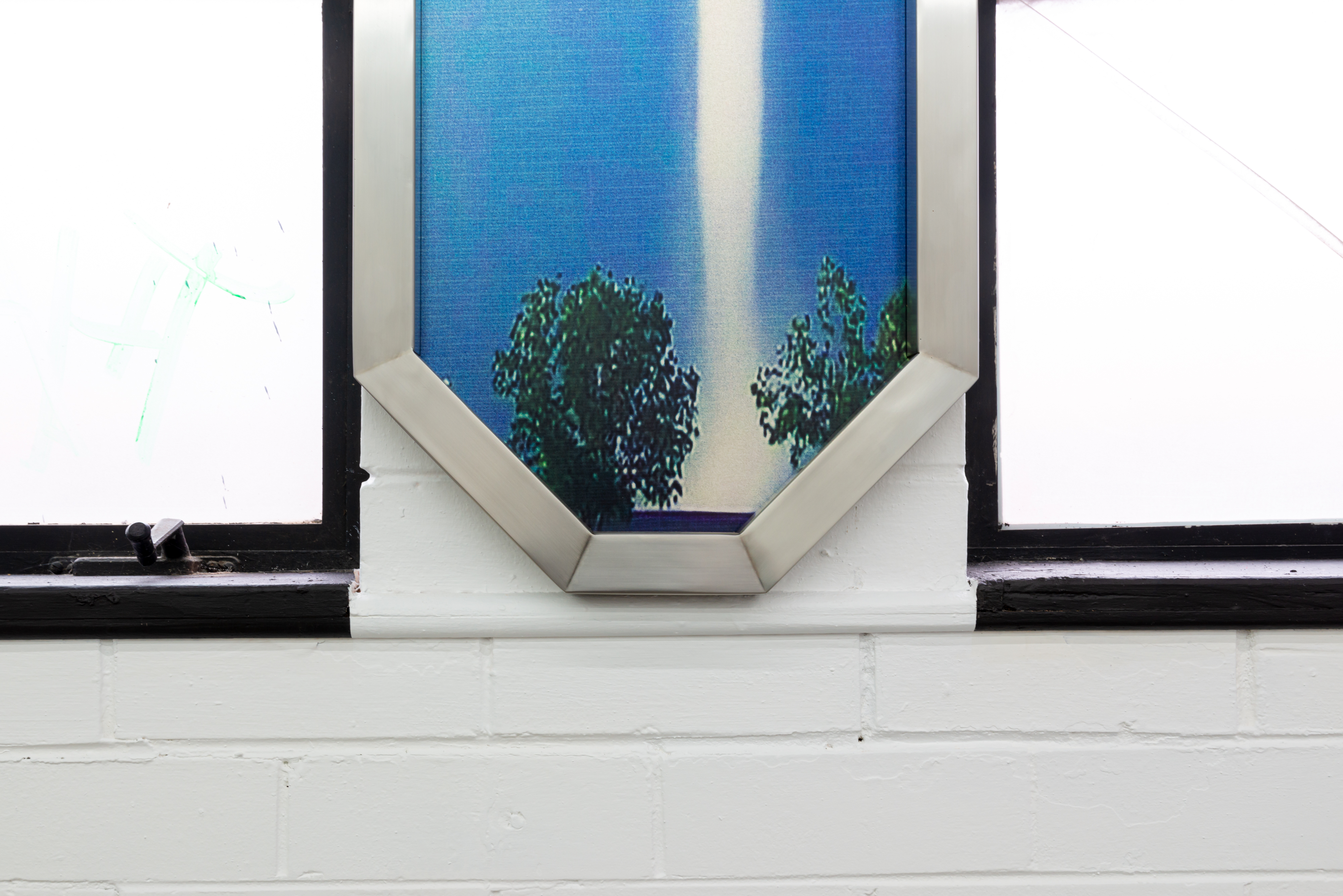 Illumination in the worn aisle, 2022, stainless steel, aluminium, photographic print on adhesive vinyl, 90 x 120 x 3.8 cm
