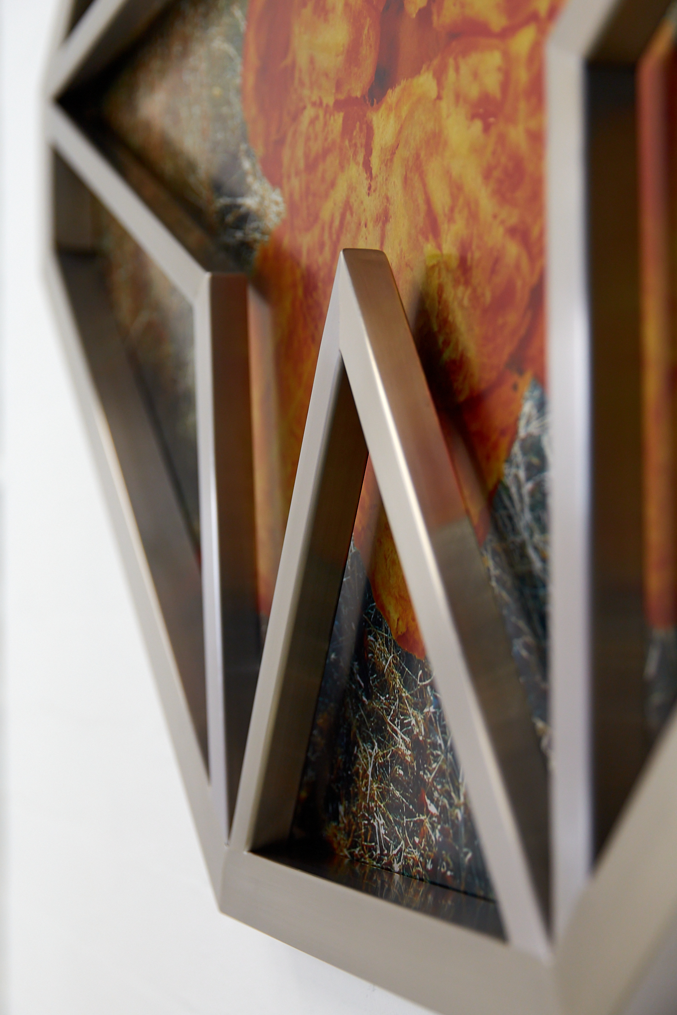 Tunnel vision, 2023, stainless steel, photographic prints on adhesive vinyl, acrylic, aluminium, 41 x 47 x 6.5 cm
